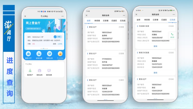 以更名過(guò)戶(hù)為例,用戶(hù)點(diǎn)擊更名過(guò)戶(hù)功能按鈕,進(jìn)入提交資料界面,按照頁(yè)面提示,填寫(xiě)相關(guān)信息和拍照上傳附件,提交預(yù)約,后臺(tái)管理人員審核通過(guò),便完成更名過(guò)戶(hù)辦理,用戶(hù)無(wú)需再到營(yíng)業(yè)大廳線(xiàn)下辦理任何手續(xù)。